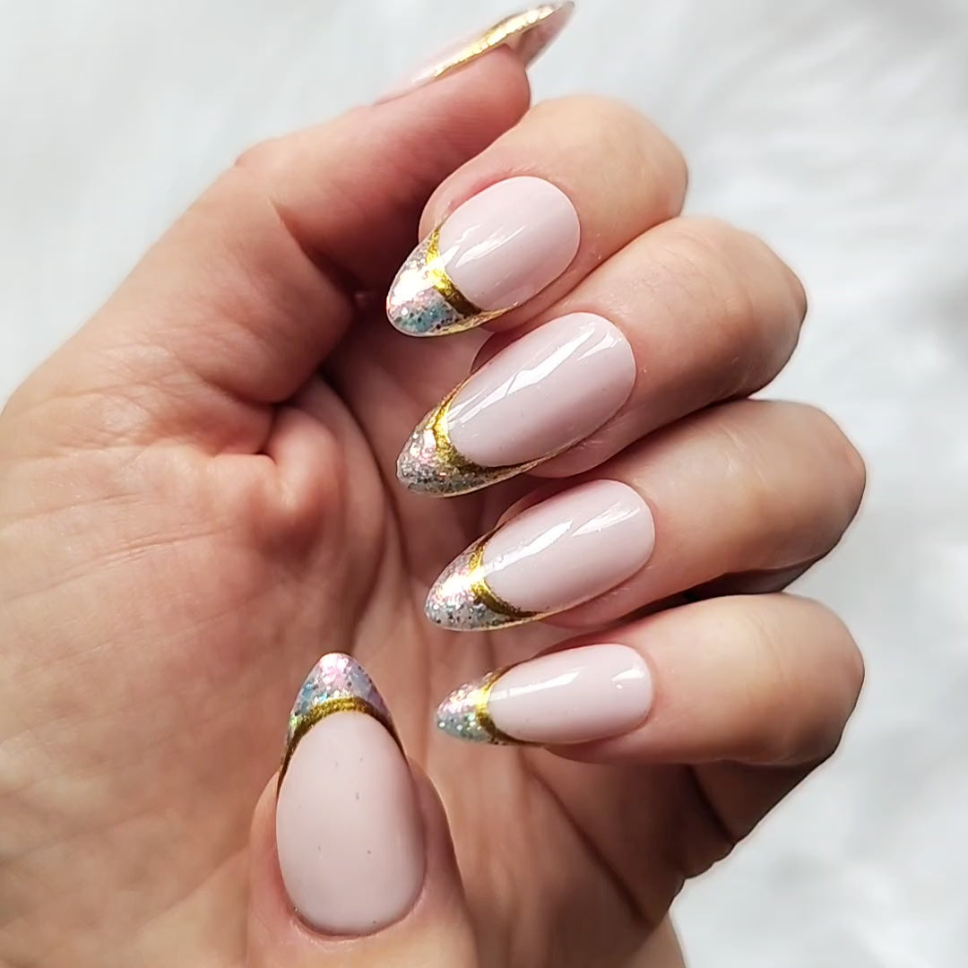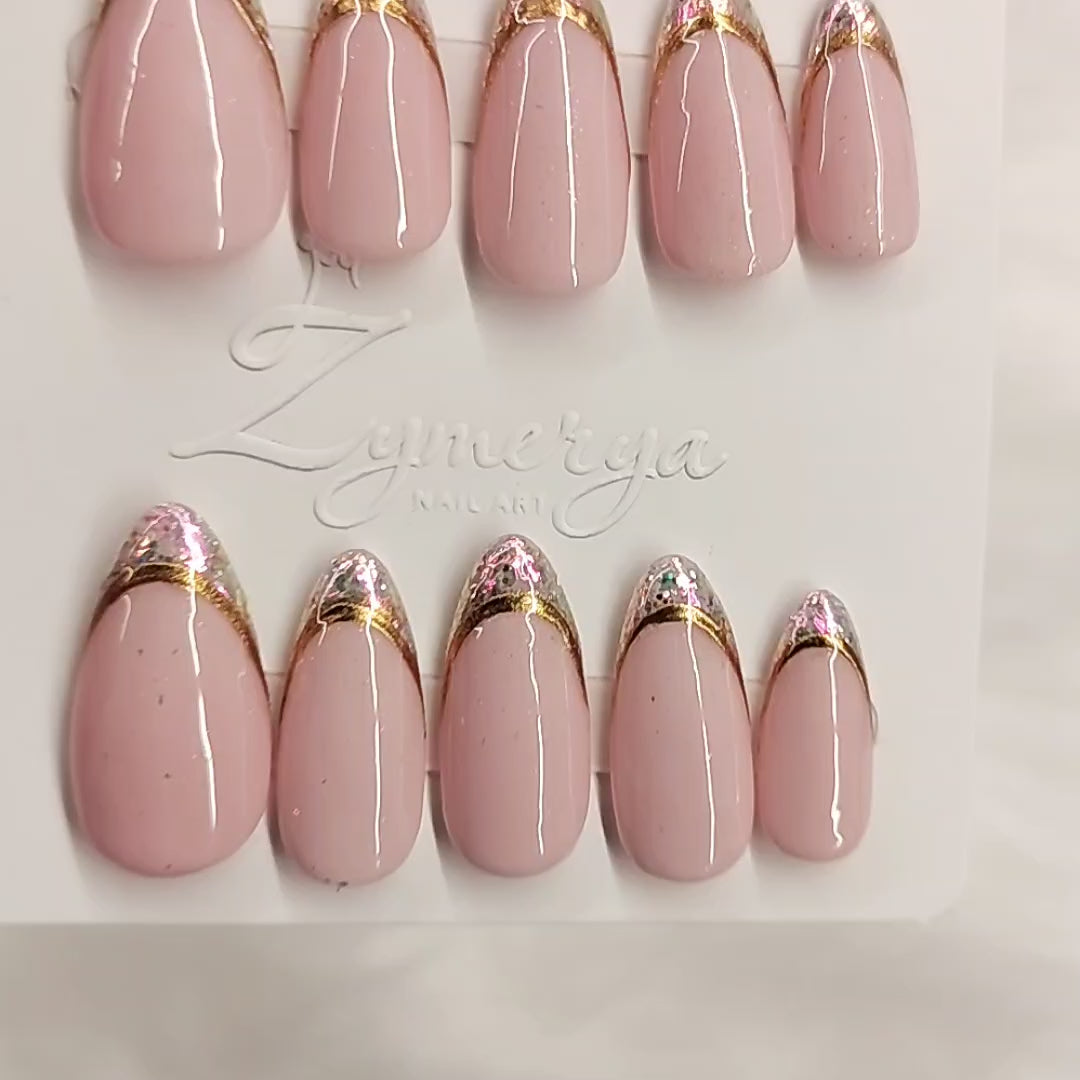 Ongles réutilisables aux teintes roses douces et intemporelles. Chaque ongle est orné d'un bout scintillant parsemé de paillettes et d'une élégante rayure dorée qui capte la lumière. Parfaits pour ajouter une touche de sophistication à votre look sans engagement permanent. Faciles à appliquer et à retirer, ils offrent une manucure impeccable en quelques minutes.